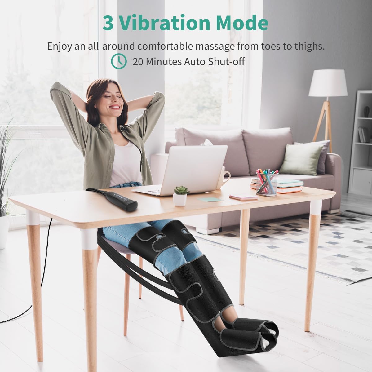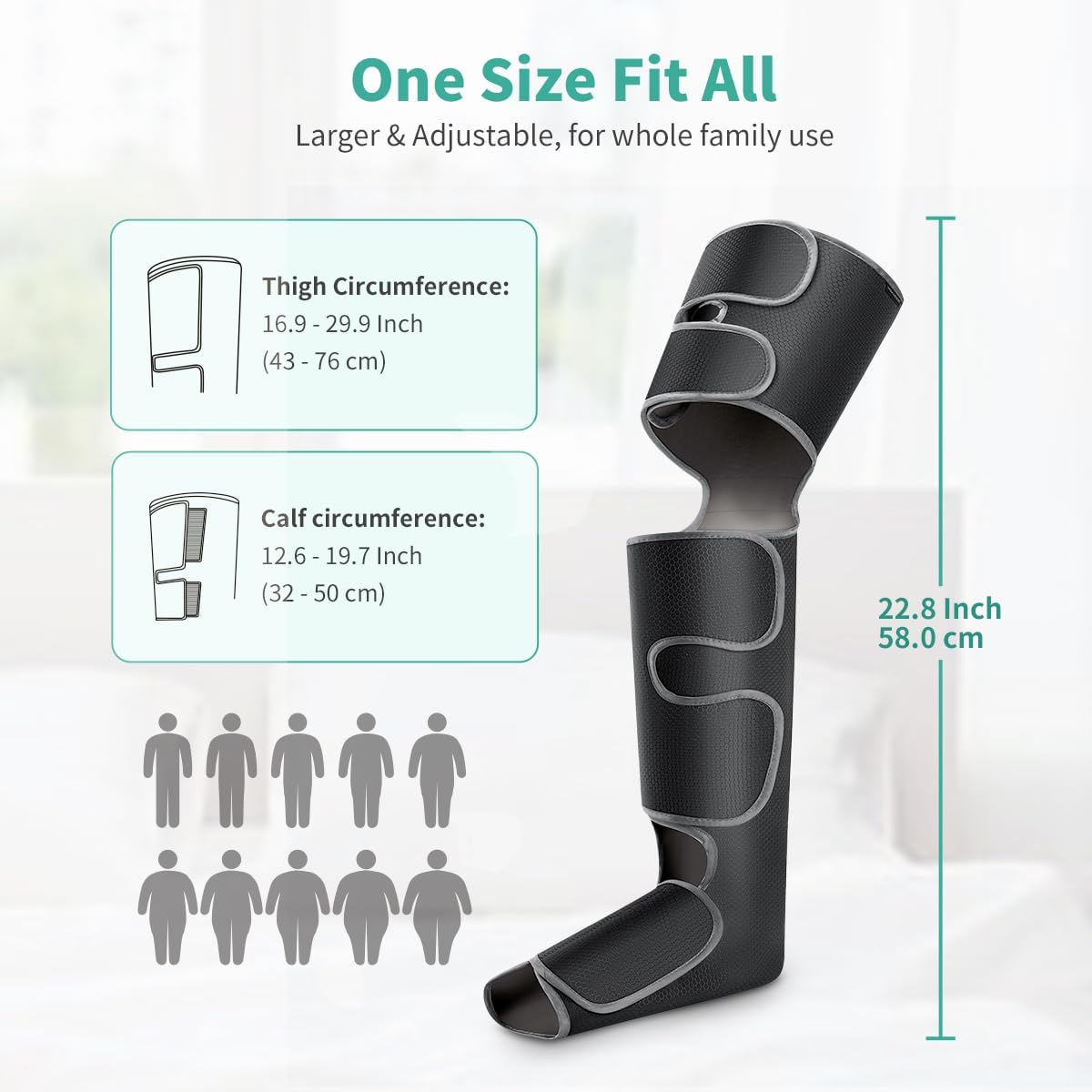 أحزمة الفيلكرو القابلة للتعديل تغطي الساق بالكامل وتزيد أثر التدليك، وتناسب معظم المقاسات — محيط الساق حتى 50 سم ومحيط الفخذ حتى 76 سم. يُنصح بترك فراغ صغير (3–4 أصابع) عند الربط لتجنب الشد. خامات محسّنة سهلة التنظيف بممسحة مبللة، والجهاز قابل للطي مع حقيبة حمل مرفقة عشان تاخذه معك للمكتب أو الجيم بسهولة. ملاحظة: يعمل بكابل كهرباء (AC).