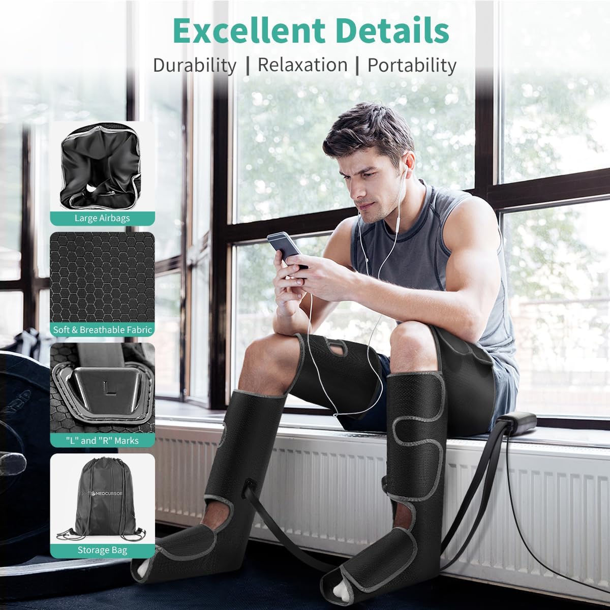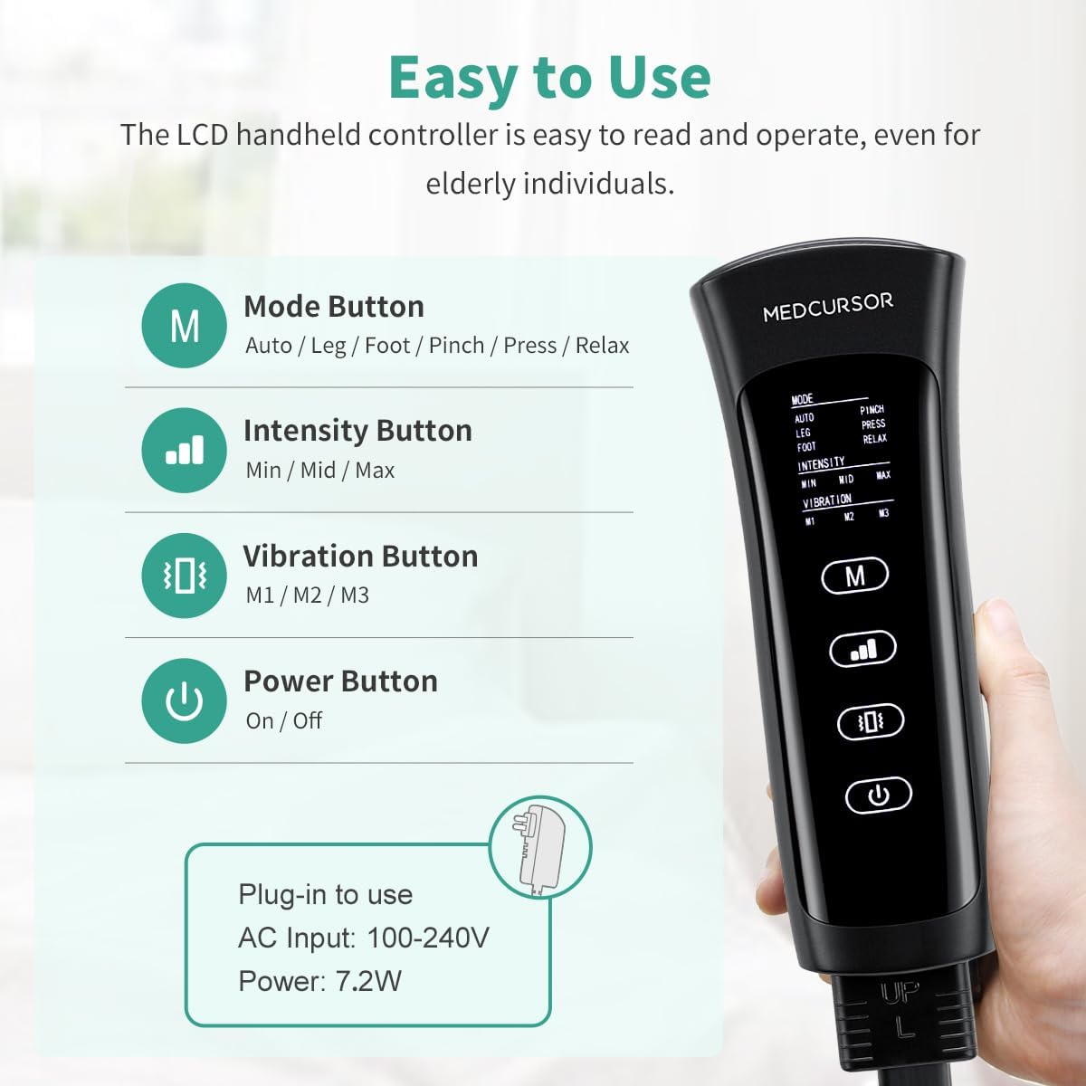 الإجهاد المتكرر والوقوف لساعات أو الجلوس الطويل يسبب تدفقًا دمويًا سيئًا وتعبًا مزمنًا في الساقين. جهاز Medcursor لتدليك الساق بالضغط الهوائي مصمم ليحاكي يد المدلك المحترف ويعالج التورم، الألم، والإرهاق ليعيد لك الراحة والنشاط بسرعة.
